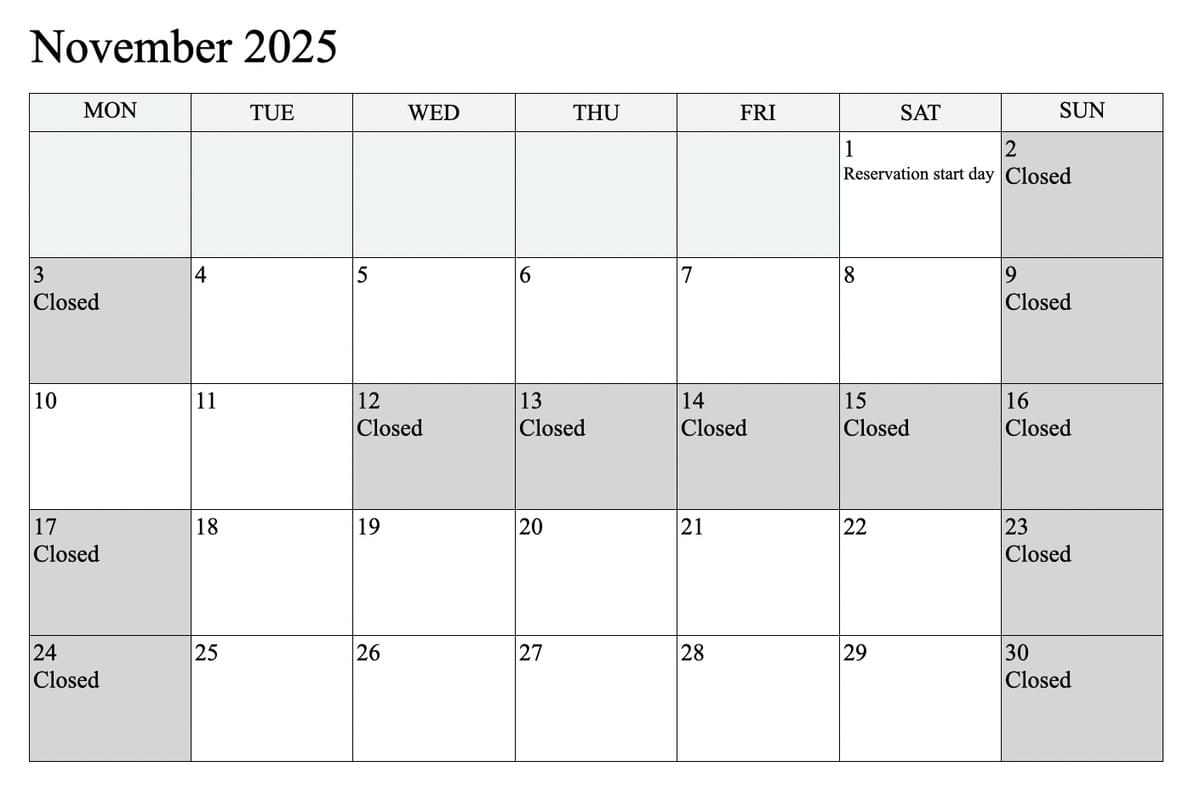 ・Our reservation opens for each month at 10:00 am on the first business day of the previous month.